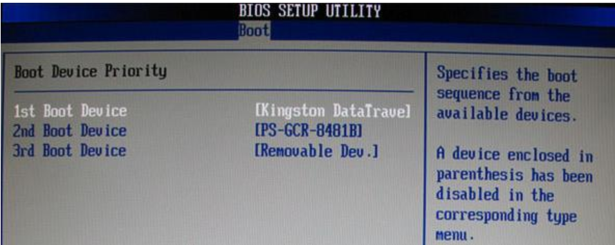 Step2:U盤(pán)制作完成后,查詢(xún)?cè)撾娔X型號(hào)的U盤(pán)啟動(dòng)快捷鍵。接著重啟電腦,在重啟電腦的過(guò)程中不斷地按下快捷鍵,稍后電腦會(huì)顯示啟動(dòng)項(xiàng)設(shè)置,這時(shí)我們將U盤(pán)作為第一啟動(dòng)項(xiàng)即可
