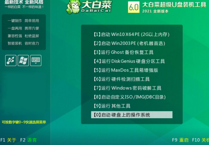 3、進(jìn)入大白菜的菜單之后我們通過方向鍵選擇第一項,回車確認(rèn)。