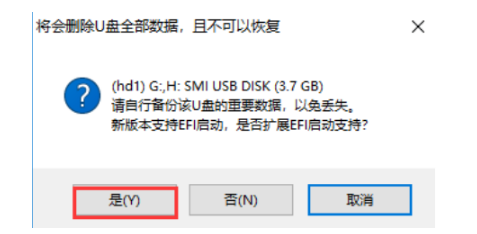 4、點(diǎn)擊一鍵制作后會(huì)彈出一個(gè)關(guān)于【U盤數(shù)據(jù)刪除且不可恢復(fù)】的窗口,選擇【是】。