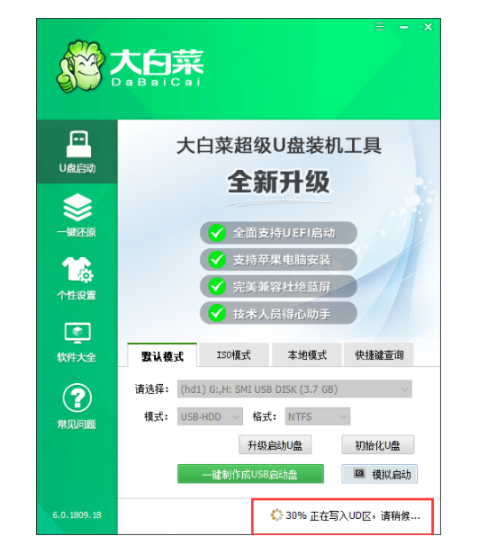 5、等待該工具對(duì)U盤進(jìn)行一個(gè)相關(guān)數(shù)據(jù)的寫入,右下角會(huì)有【進(jìn)程顯示】。