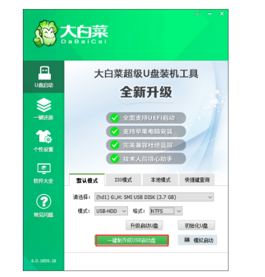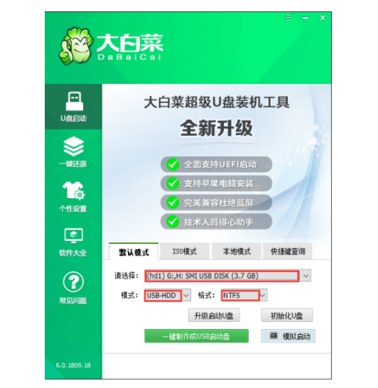 1、打開大白菜超級(jí)U盤裝機(jī)工具,插入U(xiǎn)盤,點(diǎn)擊【U盤啟動(dòng)】模塊,然后選擇【默認(rèn)模式】。