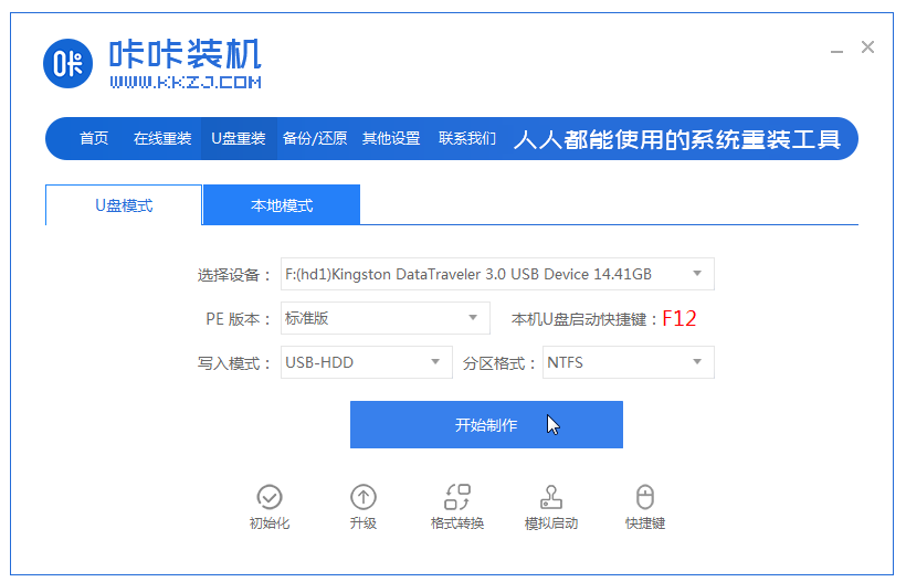 2、選擇U盤模式,點擊“開始制作”按鈕。