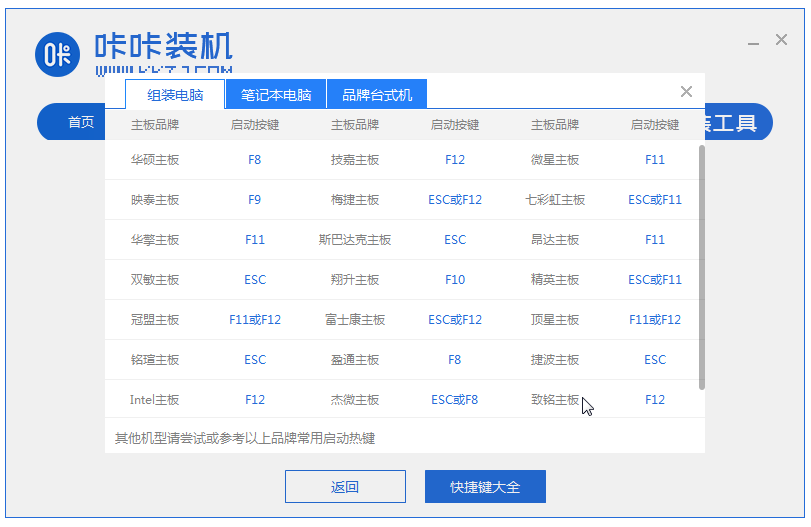 5、在快捷鍵大全中查看自己電腦對應(yīng)的啟動快捷鍵,確認完畢后將u盤拔出并插入需要重裝系統(tǒng)的電腦上。
