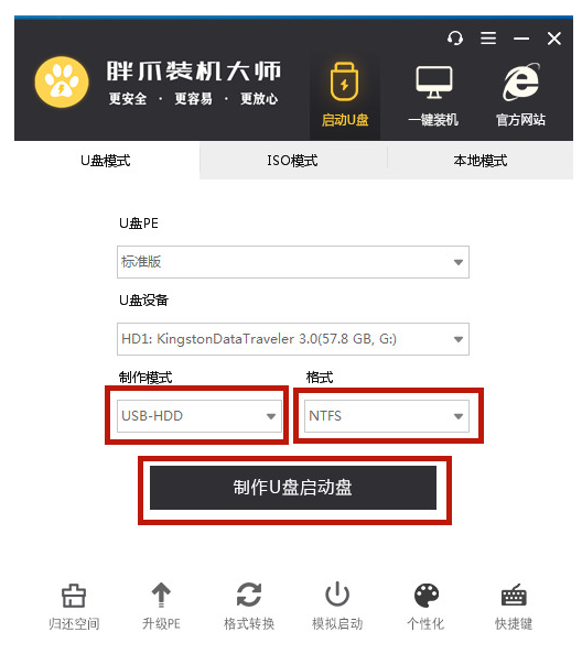 2.然后打開該軟件,插入一個空白U盤,之后將制作模式設(shè)置為“usb-hdd”,格式設(shè)置為“ntfs”,然后點(diǎn)擊“制作U盤啟動盤”。