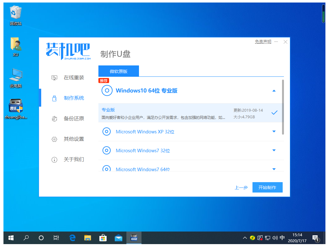 2、選擇本次需要重裝的win10系統(tǒng),然后點(diǎn)擊開(kāi)始制作。