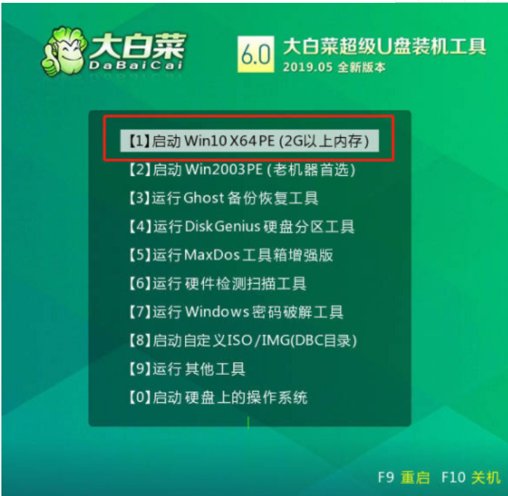 4.出現(xiàn)大白菜主界面時(shí),選擇win10X64PE(2G以上內(nèi)存),按回車進(jìn)入winpe桌面即可。