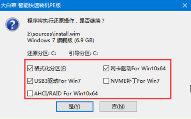 6.當(dāng)電腦彈出還原窗口后,建議勾選“網(wǎng)卡驅(qū)動(dòng)”以及“USB驅(qū)動(dòng)”復(fù)選框,單擊“是”。當(dāng)電腦重新啟動(dòng)時(shí),將U盤取出,以免再次進(jìn)入白菜桌面。