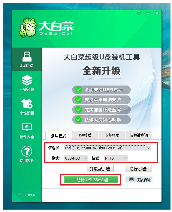 1、隨后打開大白菜制作工具,保留默認(rèn)設(shè)置,直接點擊一鍵制作。等待大白菜U盤啟動盤制作完成后,將剛剛下載的系統(tǒng)鏡像文件保存到U盤啟動盤中。