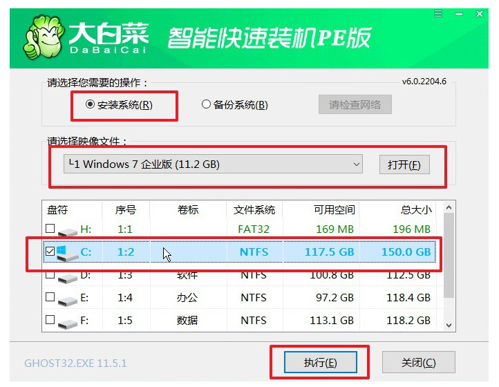 1、打開大白菜一鍵裝機軟件,勾選安裝系統(tǒng),選擇需要重裝的映像文件,然后選擇安裝在“C盤”,三項都設(shè)置完成后點擊執(zhí)行。
