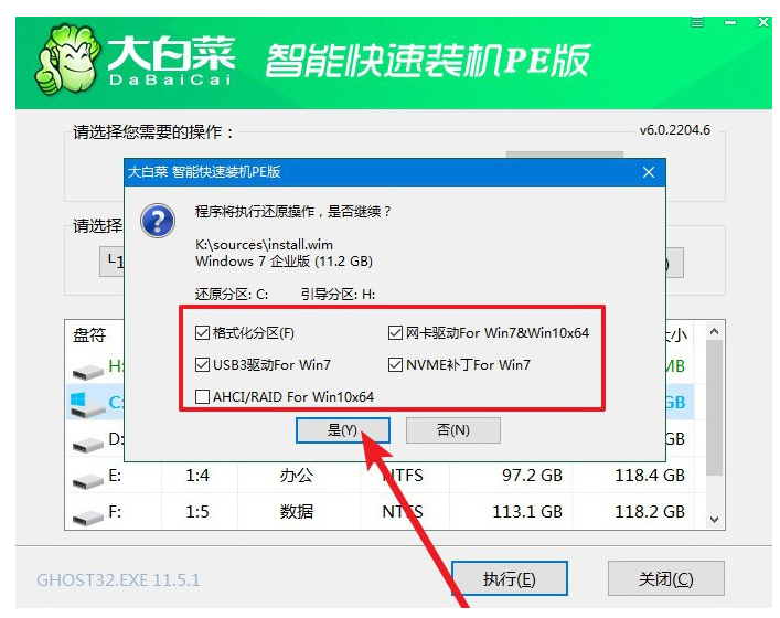 2、出現(xiàn)一鍵還原窗口時,建議默認(rèn)勾選,注意檢查網(wǎng)卡和USB復(fù)選框,避免重裝系統(tǒng)后出現(xiàn)其他問題,然后點擊“是”并等待軟件自行操作。