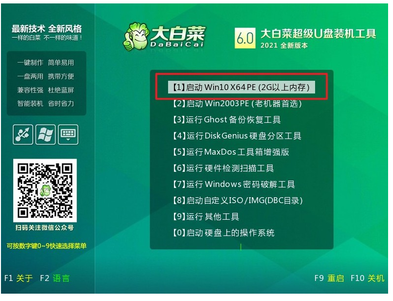 2、在大白菜winpe主菜單中,選擇[1]項,然后回車即可進入大白菜u盤winpe系統(tǒng)桌面。