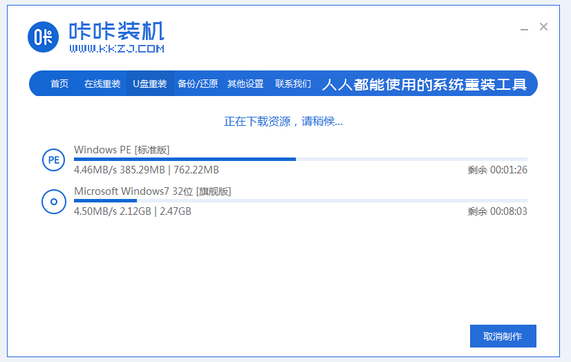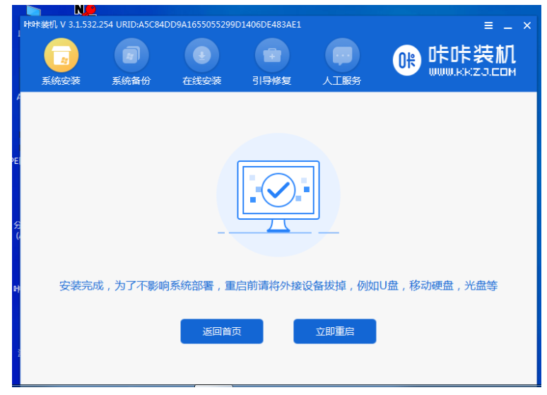 9、進入pe系統(tǒng)后,打開咔咔軟件就會開始自動安裝系統(tǒng)。安裝完成后,按照提示再次重啟電腦。