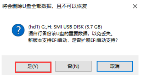 3、按下一鍵制作,彈出關(guān)于“U盤數(shù)據(jù)刪除且無法恢復(fù)”的窗口,選擇【是】。