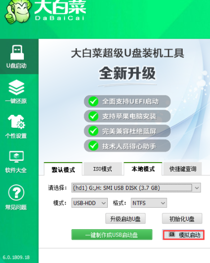5、完成后,點(diǎn)擊模擬啟動,如圖所示的界面意味著U盤啟動盤的制作已成功完成。