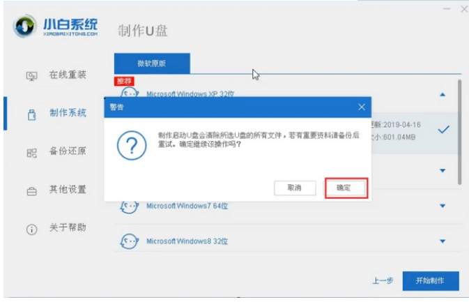3、此時(shí)將會(huì)彈出格式化U盤操作,在確定保存好重要數(shù)據(jù)之后,點(diǎn)擊“確認(rèn)”,等待U盤制作完成之后,點(diǎn)擊重啟電腦。