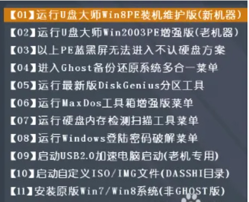 1、下載U盤(pán)裝機(jī)大師來(lái)制作的啟動(dòng)U盤(pán)。把U盤(pán)插入電腦USB插口,然后重啟電腦,按快捷鍵啟動(dòng),自己上網(wǎng)搜索電腦的快捷鍵,各各電腦都不一樣。選擇【01】項(xiàng)。