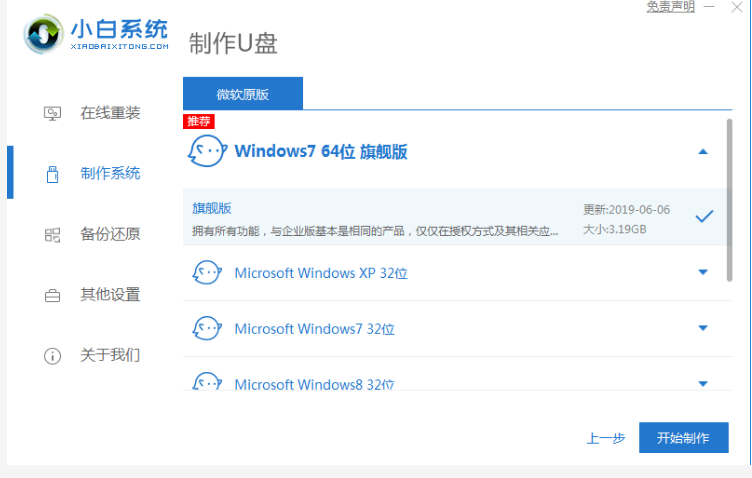 1、首先打開電腦,保持聯(lián)網(wǎng)以及供電狀態(tài),準(zhǔn)備一個(gè)空白的8G以上的U盤,瀏覽器下載安裝好小白一鍵重裝軟件并打開,選擇制作系統(tǒng),點(diǎn)擊開始制作。