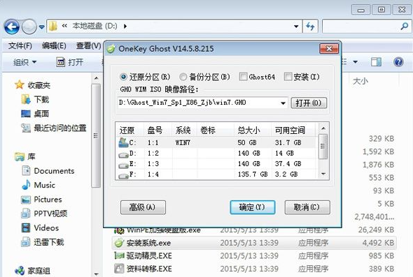 3、雙擊【安裝系統(tǒng).exe】,打開安裝工具onekey ghost,選擇“還原分區(qū)”,加載映像路徑win7.gho,選擇安裝位置如C盤,點(diǎn)擊確定。