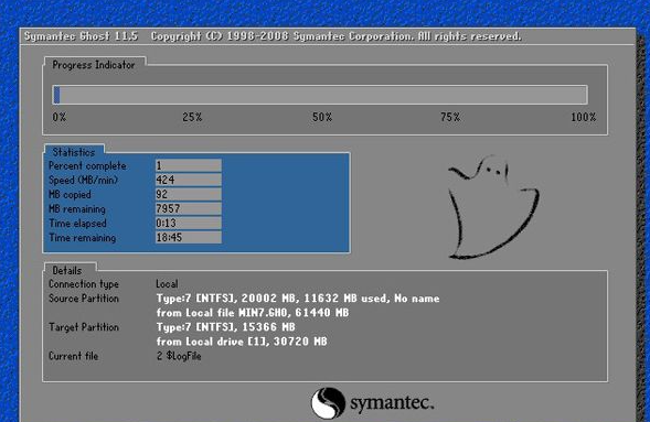 5、這時電腦就會自動重啟,進(jìn)入ghost系統(tǒng)環(huán)境,我們可以通過進(jìn)度條看到系統(tǒng)還原的進(jìn)度。