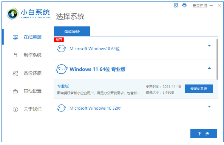 1.打開小白一鍵重裝系統(tǒng)軟件,選擇系統(tǒng),點擊下一步;