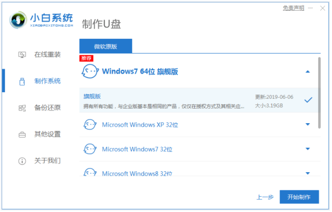 2、選擇我們所需要的win7操作系統(tǒng),點(diǎn)擊開(kāi)始制作。