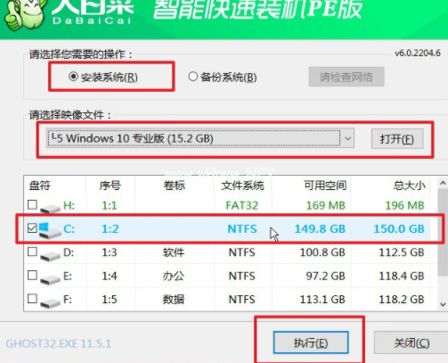 1.進入桌面,點擊打開一鍵裝機軟件,選擇安裝win10系統(tǒng)在“C盤”,點擊“執(zhí)行”。