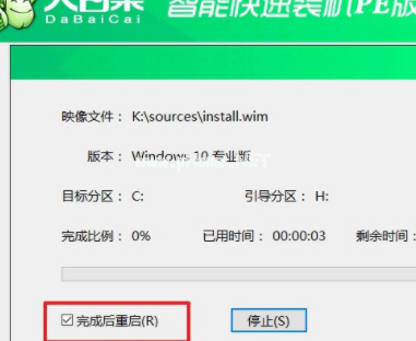 2.大白菜重裝系統(tǒng)的過程中,電腦會多次啟動,第一次重啟電腦時,拔出u盤后,無需手動操作。