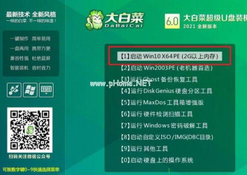 2.選擇【1】Win10X64PE(2G以上內(nèi)存),按回車進入大白菜PE系統(tǒng)桌面。