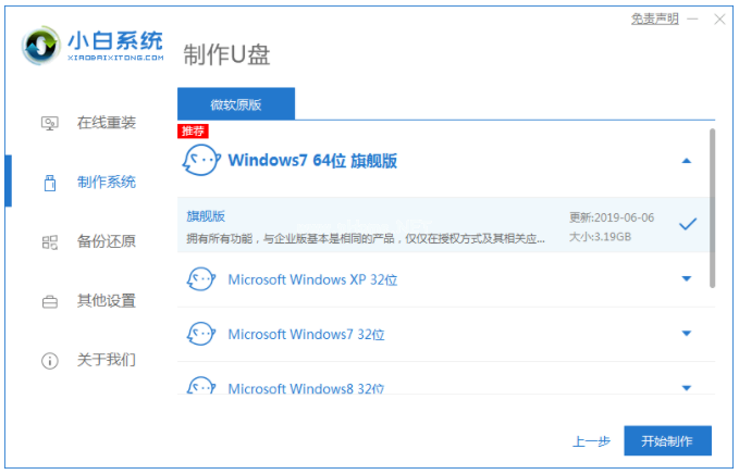 2、選擇我們需要安裝的windows操作系統(tǒng),點擊開始制作。