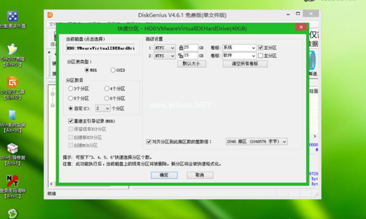 5、設置分區(qū)數(shù)目和分區(qū)的大小,通常C盤建議35G以上,如果是固態(tài)硬盤的話,勾選“對齊分區(qū)”即可4k對齊,點擊確定,執(zhí)行硬盤分區(qū)過程;