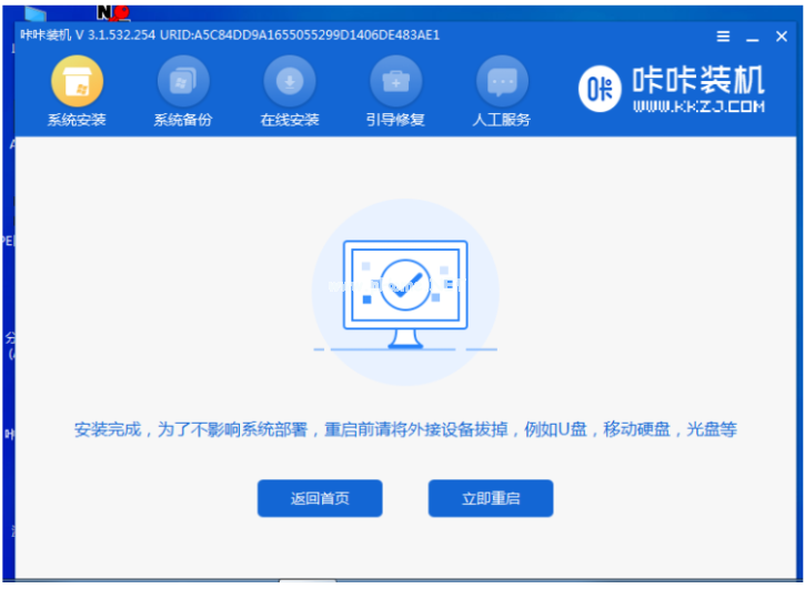 9、進入系統(tǒng)之后,點擊打開咔咔軟件就會開始安裝系統(tǒng)。系統(tǒng)安裝完成后,就請按照提示再次點擊重啟電腦