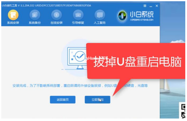 7、系統(tǒng)安裝完成后將U盤(pán)拔掉后點(diǎn)擊立即重啟電腦即可。