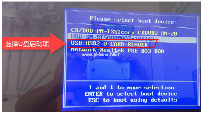 4、將u盤(pán)啟動(dòng)盤(pán)插入到需要安裝的電腦接口中,開(kāi)機(jī)不斷按啟動(dòng)快捷鍵進(jìn)啟動(dòng)的頁(yè)面,選擇u盤(pán)啟動(dòng)項(xiàng)按回車(chē)確定進(jìn)入到pe選擇界面,選擇第一項(xiàng)pe系統(tǒng)按回車(chē)進(jìn)入。