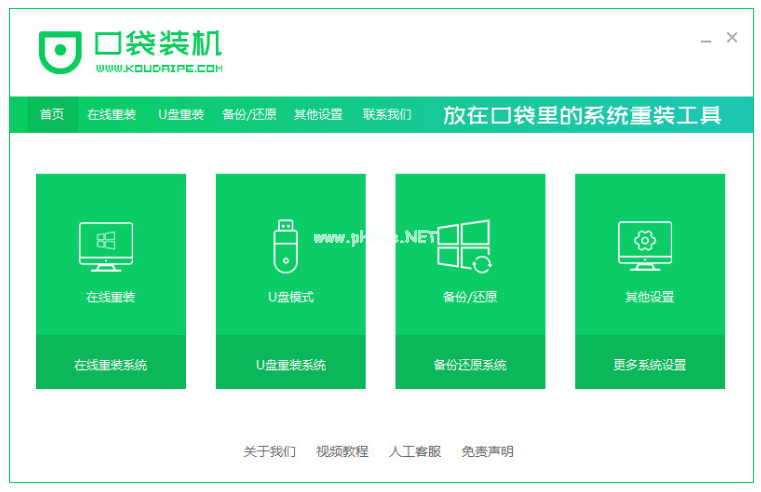 1、首先下載安裝并運行口袋裝機軟件,點擊在線重裝界面。