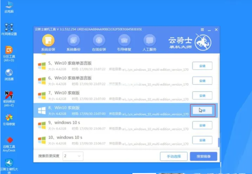 9、進(jìn)入系統(tǒng)后,云騎士軟件會(huì)自動(dòng)打開(kāi)搜索系統(tǒng)鏡像,找到鏡像,點(diǎn)擊安裝,準(zhǔn)備安裝界面中無(wú)需更改,點(diǎn)擊開(kāi)始安裝,選擇繼續(xù),等待安裝