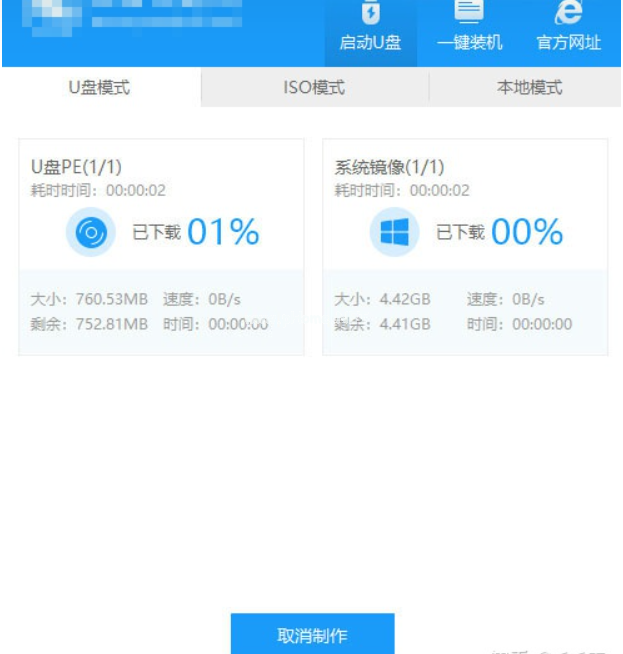 4、接下來(lái)云騎士就開(kāi)始進(jìn)行系統(tǒng)的下載,同時(shí),若想換一個(gè)系統(tǒng)下載,則可以點(diǎn)擊取消制作,進(jìn)行取消更換,在這里下載的系統(tǒng)文件較大,請(qǐng)大家耐心等待。