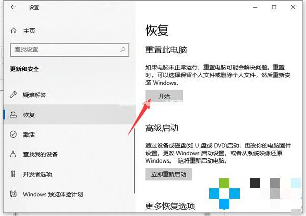 然后選擇左側(cè)的恢復(fù),再選擇右側(cè)的開(kāi)始按鍵重置電腦。