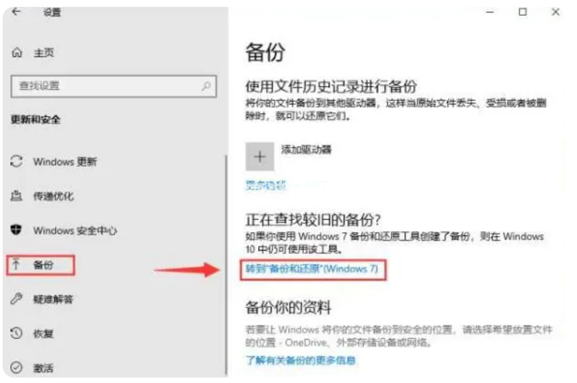 2、然后在設置左側欄目里面選擇備份,在右側選擇轉到(備份和還原)。