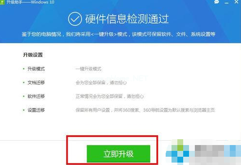 5、檢測完成后,通過會顯示如下,界面,點擊立即升級,即可把win7s升級到win10系統(tǒng)。
