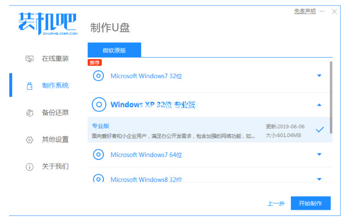 1、打開(kāi)裝機(jī)吧一鍵重裝系統(tǒng)工具,插入U(xiǎn)盤(pán),選擇U盤(pán)開(kāi)始制作;