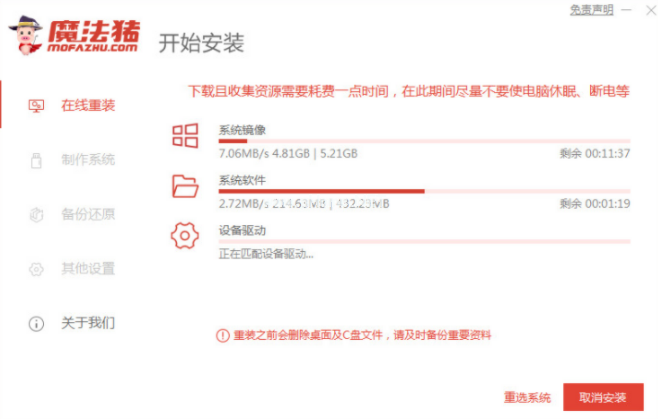 3、等待系統重裝資源下載,在此期間盡量不要使電腦休眠、斷電等。