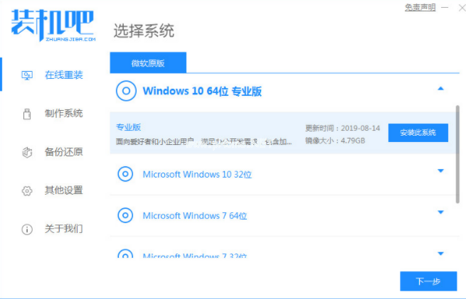1、首先我們打開電腦瀏覽器搜索裝機吧一鍵重裝系統,將軟件下載好并打開,然后選擇要下載的系統。