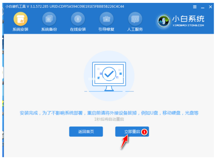 7、裝機(jī)工具自動(dòng)完成安裝,點(diǎn)擊立即重啟電腦。