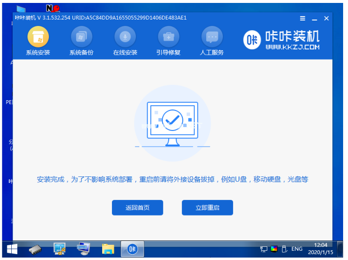 5、咔咔裝機工具打開并選擇本次需要的系統(tǒng)點擊安裝到c盤,安裝完成后,點擊立即重啟電腦。