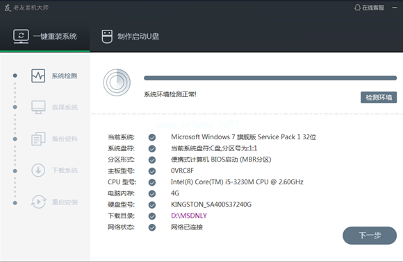 1. 下載軟件完軟件后正常打開(kāi)(“一鍵重裝系統(tǒng)”),程序會(huì)默認(rèn)檢測(cè)當(dāng)前系統(tǒng)環(huán)境,檢測(cè)完成后,點(diǎn)擊“下一步”。