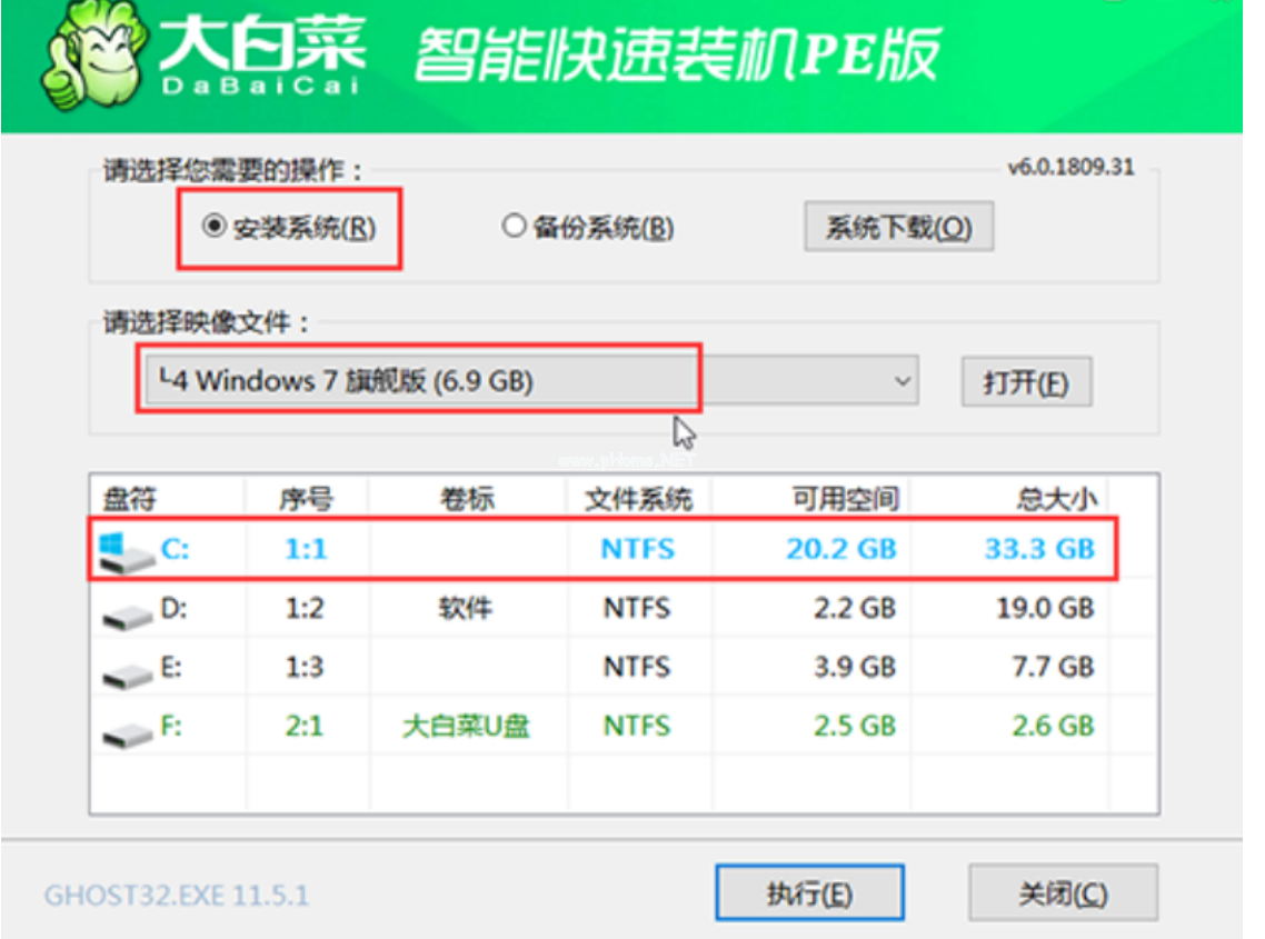 3、在桌面上找到并打開大白菜一鍵重裝,進入重裝界面后,選擇“安裝系統(tǒng)”,選擇已下載的win7鏡像系統(tǒng)作為“映像文件”,勾選安裝路徑為“C盤”,最后點擊“執(zhí)行”。