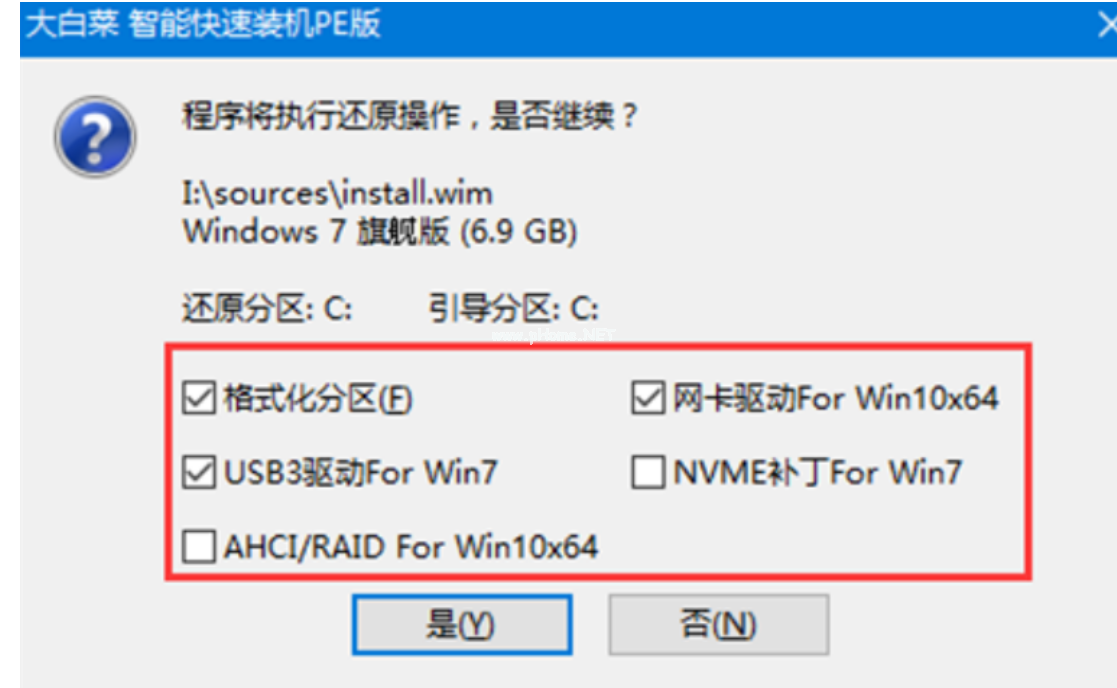 4、稍后彈出還原設置窗口,建議勾選“網(wǎng)卡驅(qū)動”以及“USB驅(qū)動”復選框,點擊“是”進入下一步。