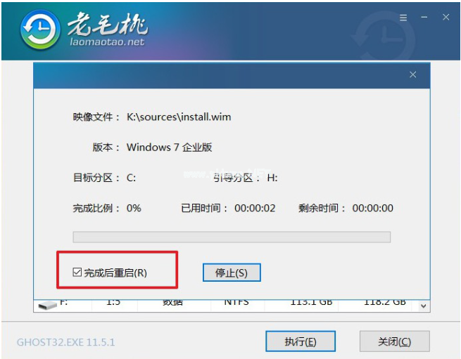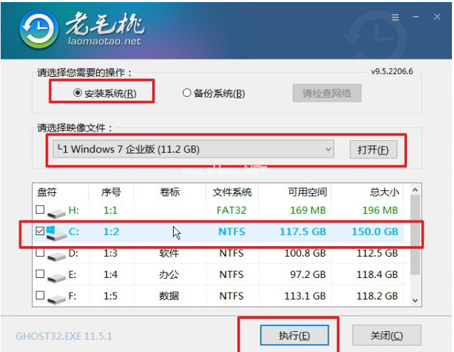 7、打開(kāi)老毛桃一鍵裝機(jī),選中win7系統(tǒng)鏡像,安裝在C盤(pán),點(diǎn)擊“執(zhí)行”進(jìn)入下一步。
