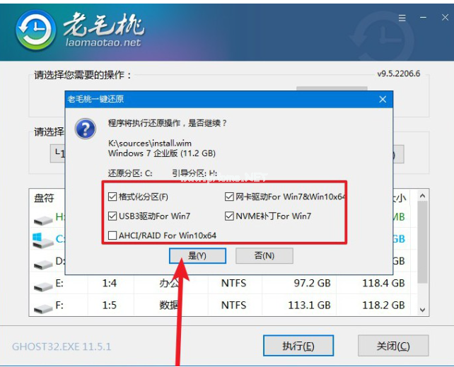 8、頁(yè)面會(huì)彈出“一鍵還原”提示框,我們默認(rèn)勾選,點(diǎn)擊“是”繼續(xù)安裝。