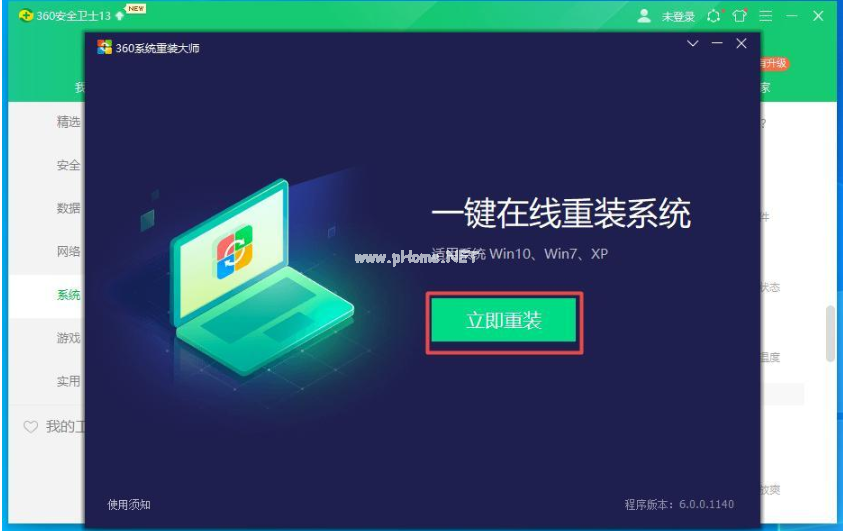 2、進(jìn)入系統(tǒng)重裝界面,在新出現(xiàn)的360系統(tǒng)重裝大師界面,點(diǎn)擊立即重裝。